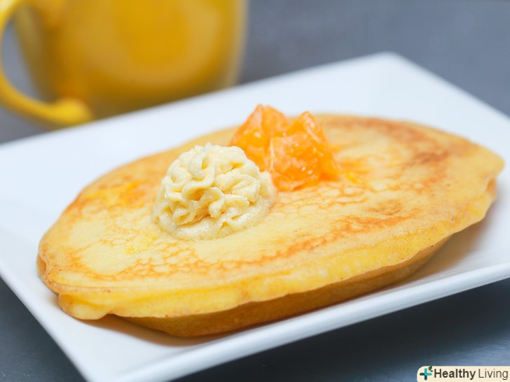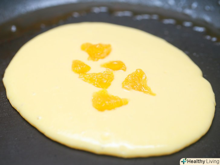 Вилийте тісто.вилийте 1/3 склянки тіста на сковороду. Зверху на млинець додайте жменю фруктів.[14]- Можна використовувати чорницю, полуницю або малину в свіжому або замороженому вигляді. Однак великі фрукти, такі як полуниця, необхідно нарізати на дрібні шматочки, перш ніж додавати в млинці. Спробуйте використовувати маленькі шматочки бананів або шоколадні чіпси.