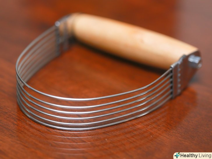 Додайте масло до сухих інгредієнтів.чистими руками, за допомогою кондитерського блендера або двома столовими ножами додайте масло до сухих інгредієнтів.[19]- Якщо ви використовуєте ножі, схрещуйте їх в товщі тіста, щоб перетерти великі шматки масла. В результаті повинна вийти розсипчаста суміш з невеликими вкрапленнями масла.[20]