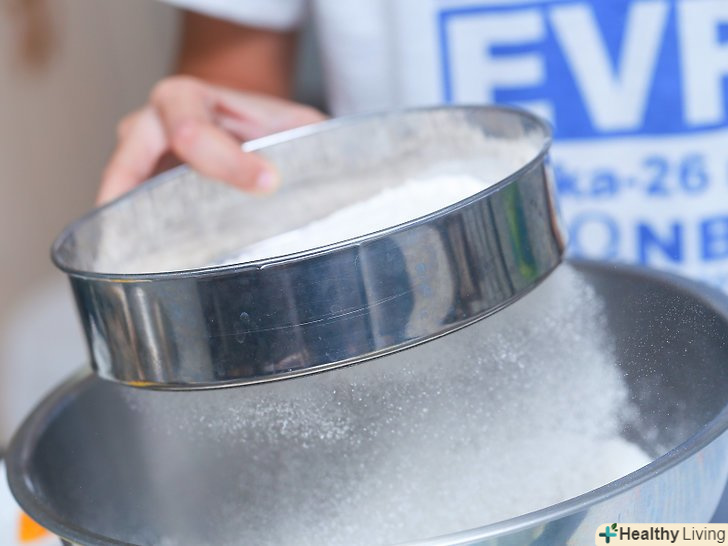Пропустіть крізь сито сухі інгредієнти.просійте ½ чайної ложки солі, ½ чайної ложки харчової соди, 2 ¼ чайних ложки розпушувача, ¼ склянки цукру і 2 склянки борошна. Якщо у вас немає просіювача, використовуйте звичайне сито. Просійте всі сухі інгредієнти в миску.[10]- Просівайте інгредієнти через сито, злегка струшуйте його або постукуйте по краях, щоб всі інгредієнти потрапили в отвори.