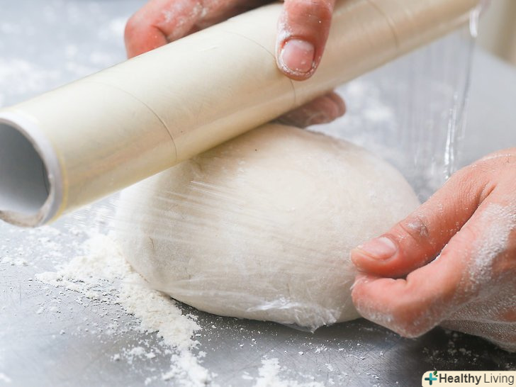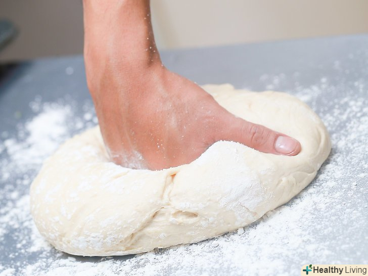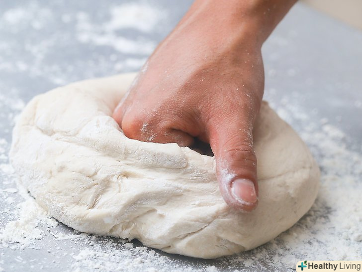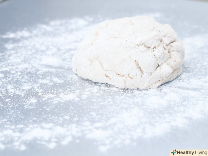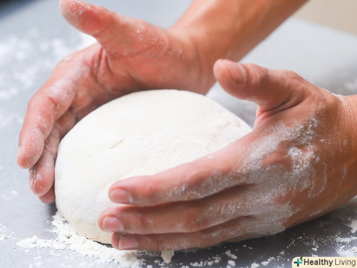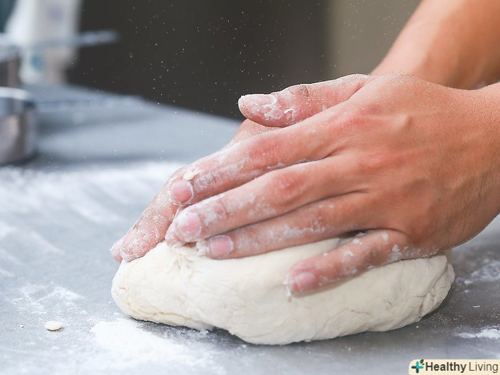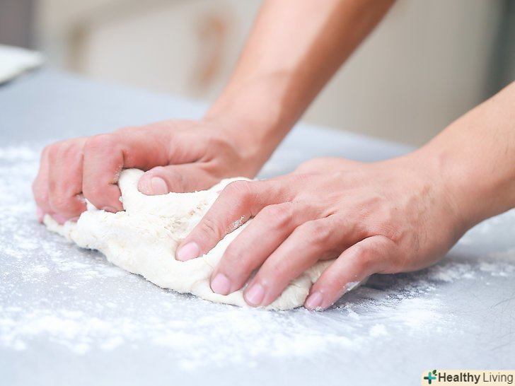 - Не забудьте гарненько посипати руки борошном, щоб тісто не прилипало; також посипайте борошном і поверхню столу. Якщо тісто здається рідким, потроху додавайте в нього борошно, продовжуючи місити.[1]