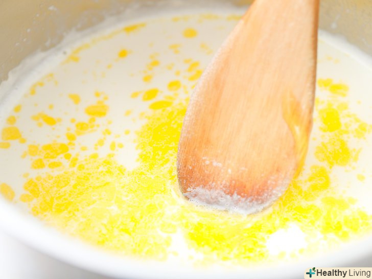 Нагрійте молоко в каструлі.швидко нагрійте молоко на сильному вогні, і як тільки воно почне закипати, зніміть каструлю з вогню. Додайте в молоко вершкове масло і цукор і ретельно перемішайте. Не доводьте молоко до кипіння; стежте за молоком і зніміть каструлю з плити тоді, коли над молоком почне утворюватися пар. Дозвольте молоку трохи охолонути, а потім додайте в нього дріжджі.- Або розігрійте молоко в мікрохвильовій печі і додайте в нього масло і цукор (поки молоко гаряче).[3]