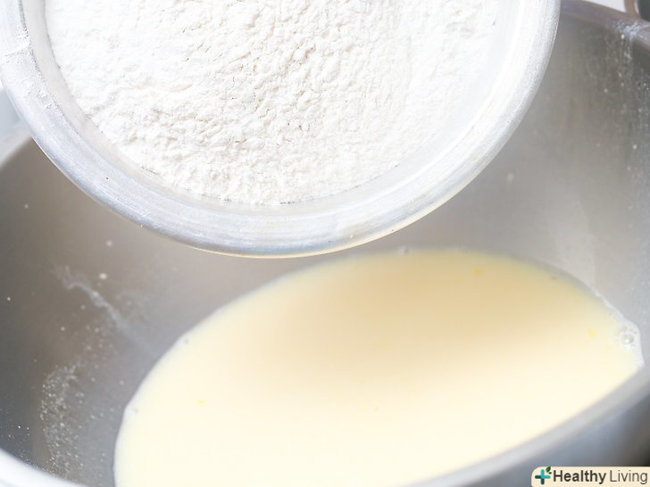 Перемішайте рідку суміш і 1 склянку борошна в міксері.перемішуйте інгредієнти в міксері на середній швидкості протягом 2 хвилин. Коли тісто почне утворюватися, поступово додавайте борошно (по одній склянці за один раз). Додавши всю муку, перемішуйте тісто на високій швидкості протягом ще 2 хвилин.- Кількість додається борошна буде залежати від того, наскільки вона волога, тому уважно спостерігайте за тестом, щоб визначити, коли борошна стане достатньо. Пшеничне борошно буває різною, тобто вам може знадобитися менше борошна, щоб замісити тісто. Ви можете спробувати змішати два види борошна (пшеничне і біле) в пропорції 50/50, щоб компенсувати різницю.