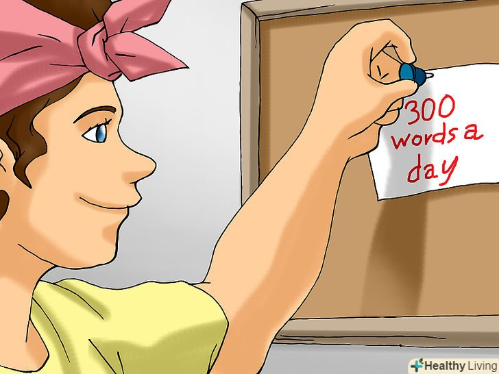 Ставте щоденні цілі.кожен день можна писати необмежену кількість тексту, але не менше певного обсягу. Тільки так у вас вийде зосередитися.- Поставте за мету писати 300 слів на день або працювати протягом години, щоб слідувати своєму графіку. Норма 300 слів в день – це невеликий обсяг, але цілком підходяща відправна точка. Якщо ви новачок або дуже зайняті, то ставте менші цілі, які реально досягти.