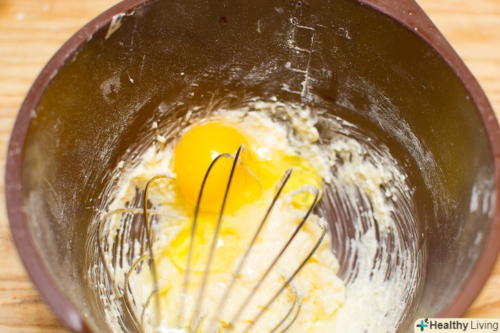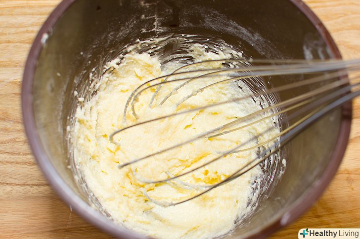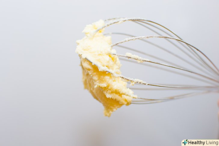 Збийте вершкове масло з цукром.спочатку збийте масло за допомогою міксера так, щоб воно стало нагадувати збиті вершки. Після цього ви можете додати лимонну цедру і цукор. Ретельно перемішайте, щоб суміш масла, цедри і цукру стала більш повітряної. Не забувайте збирати зі стінок залишки інгредієнтів.[9]- Перед збиванням масло необхідно розм'якшити, оскільки м'яке масло набагато простіше змішувати з іншими інгредієнтами. Щоб масло стало досить м'яким, дістаньте його з холодильника за 30-60 хвилин до початку готування.[10]