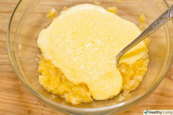 Підготуйте банани.роздушіть банани так, щоб перетворити їх однорідне пюре. Можна зробити це за допомогою вилки, картоплем'ялки або блендера. Додайте трохи соку лимона, щоб банани не стали коричневими.[8] додайте також 1 чайну ложку цукру. Приберіть в сторону на деякий час.