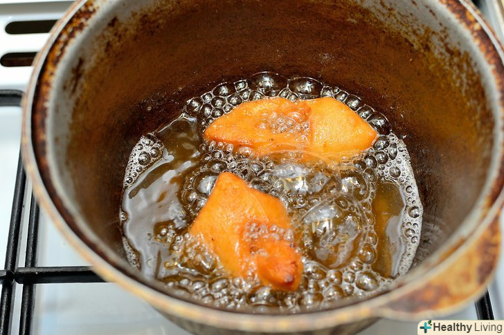 Нагрійте масло в глибокій каструлі.Налийте 1.25-2.5 см. масла каноли або рослинного масла в середню неглибоку сковороду або каструлю. Нагрійте на великому вогні, поки температура не досягне 190 °C.- У каструлі або сковороді, яку ви використовуєте має бути товсте дно і високі сторони, щоб запобігти розбризкування гарячого масла.