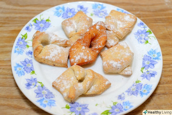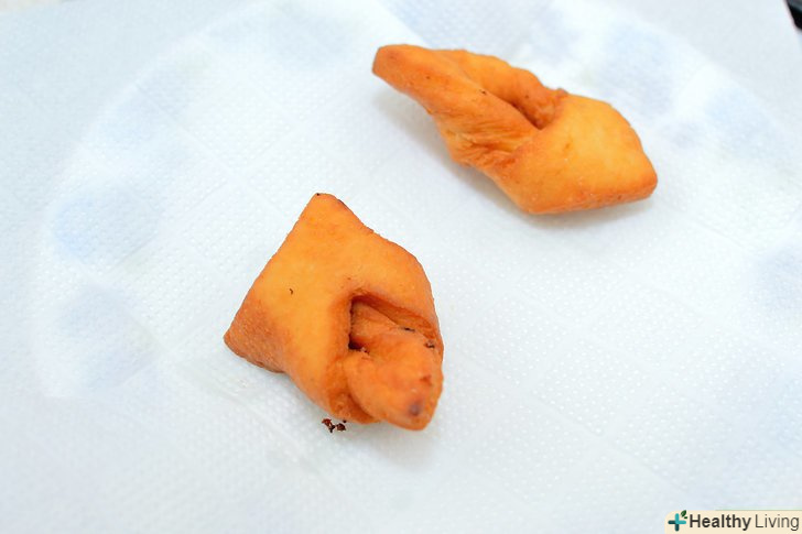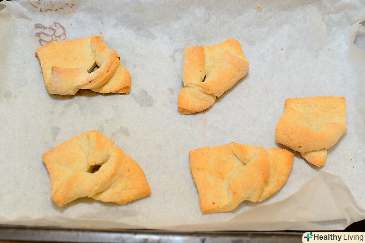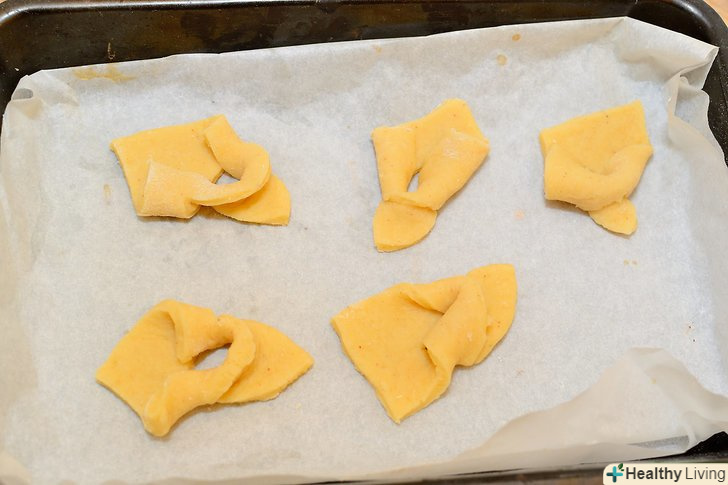 З іншого боку, створіть вузли.розріжте тісто на 5 см. квадрати. Розріжте кожен квадрат навпіл по діагоналі, потім проткніть невеликий отвір в центрі кожного трикутника. Обережно протягніть один з кутів трикутника через отвір, утворюючи вузол.- Для формування 5 см. квадратів, розріжте розкатаний прямокутник тіста на 5 см.смужки ножем або різаком для піци. Розріжте тісто поперек на інший набір 5 см. смужок, утворюючи квадрати.