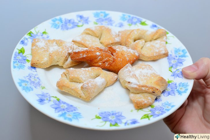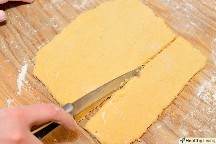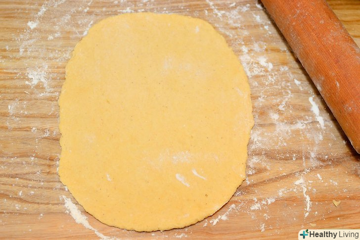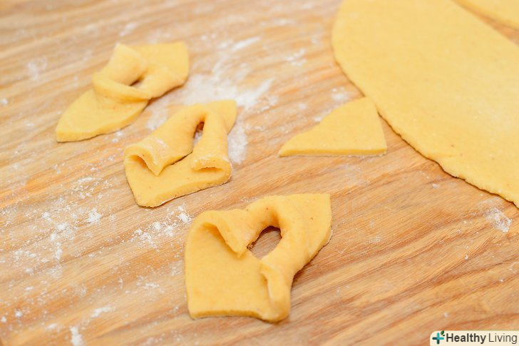 Розкачайте тісто.покладіть охолоджене тісто на чисту злегка посипану борошном поверхню. Качалкою посипаною борошном розкачайте тісто, поки воно не буде товщиною 0.6 см.по всьому периметру.- Намагайтеся розкачати тісто у формі прямокутника. Якщо є нерівні краї, ножем обріжте їх перш, ніж нарізати основну частину тіста на шматки. Обрізки тіста повторно замішують разом і знову розгортають після формування шматків від основної частини. Наріжте додаткові шматки з цих обрізків, якщо ви розкачали обрізки в форму, з якою можна працювати.