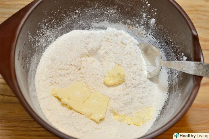 Вмішайте масло.висипте нарізане масло на сухі інгредієнти. Використовуйте кондитерський блендер або вилку, щоб вмішати масло в ці інгредієнти, продовжуючи до тих пір, поки масло рівномірно не розподілиться і, поки суміш не буде виглядати грубими крихтами.- Масло повинно бути розм'якшеним і нарізаним дрібними кубиками, перш ніж додати його в сухі інгредієнти.