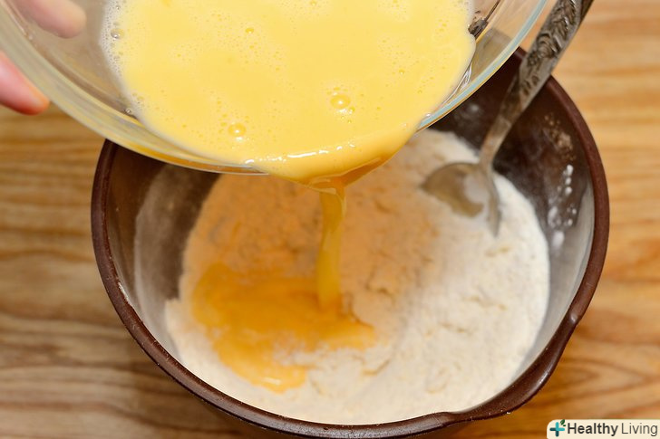 Поступово змішайте сухі та рідкі інгредієнти.сформуйте ямку в центрі сухих інгредієнтів. Вилийте яєчну суміш в цю ямку, а потім поступово змішайте сухі інгредієнти від сторін ямки в центр. Продовжуйте перемішувати, поки вологі і сухі інгредієнти не будуть повністю змішані.- Крім того, можна спробувати додати трохи вологої суміші за один раз, змішуючи після кожного додавання. Сформуйте ямку в середині сухих інгредієнтів і налийте третину яєчного жовтка в центр. Добре перемішайте, потім додайте ще одну третину і знову перемішайте. Повторіть з залишилася яєчною сумішшю.
