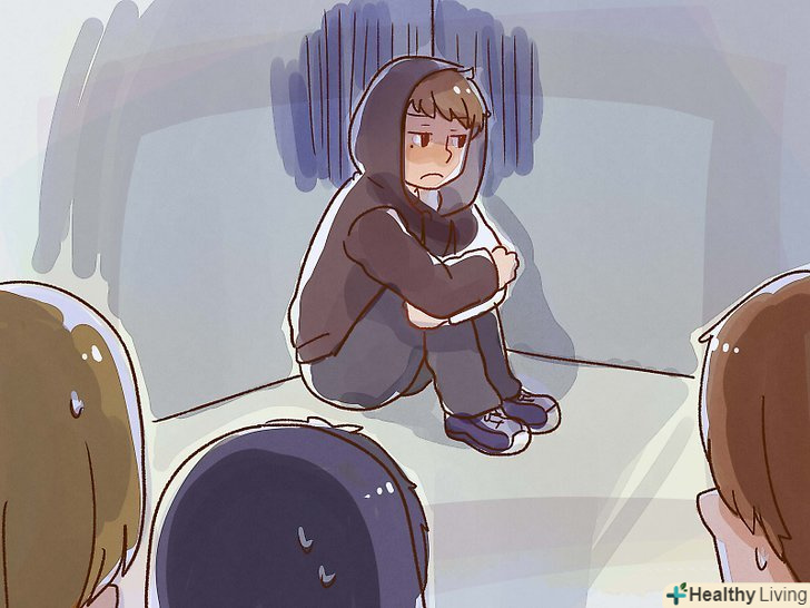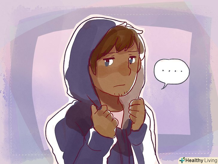 Стійте трохи віддалік від інших персонажів.люди в депресії віддаляються від друзів і рідних. Якщо ви хочете показати глядачами, що ваш герой страждає від депресії, на сцені тримайтеся подалі від інших персонажів. Коли з боку буде здаватися, що людина не схильна спілкуватися з іншими звичним чином, люди зрозуміють цей візуальний посил.- Замість того щоб просто стояти на сцені, сядьте на підлогу де-небудь в кутку і обхопіть руками коліна. Додатковим бонусом може стати натягнутий на голову капюшон толстовки.[3]