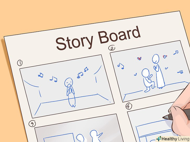 Зробіть сценарну розкадровку .Один із способів спростити написання мюзиклу-це створити сценарну розкадровку або візуальне представлення кожної сцени. Можна писати на звичайному папері або взяти великі листи. Розкадровка кожної сцени дасть вам краще уявлення про дії і мотивації персонажів. Крім того, так буде простіше написати музику і пісні для мюзиклу.[5] Зробіть сценарну розкадровку .Один із способів спростити написання мюзиклу-це створити сценарну розкадровку або візуальне представлення кожної сцени. Можна писати на звичайному папері або взяти великі листи. Розкадровка кожної сцени дасть вам краще уявлення про дії і мотивації персонажів. Крім того, так буде простіше написати музику і пісні для мюзиклу.[5]- Складіть приблизний список сцен, а потім створіть розкадрування для кожної з них. Намагайтеся вносити необхідні візуальні елементи для всіх сцен в розкадровці. Не бійтеся використовувати багато кадрів, так як чим більш детально ви все розпишете, тим більш глибоким вийде мюзикл.