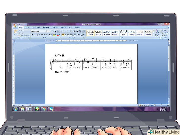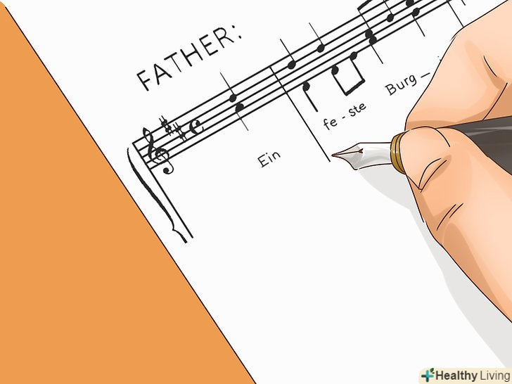 Об'єднайте музику та історію.приведіть в порядок свою роботу, помістивши сцени, музику і слова в один документ. Впровадьте музику в сцени так, щоб все звучало цілісно і гармонійно. Перевірте, чи плавно переходять розмови в пісні.[8] Об'єднайте музику та історію.приведіть в порядок свою роботу, помістивши сцени, музику і слова в один документ. Впровадьте музику в сцени так, щоб все звучало цілісно і гармонійно. Перевірте, чи плавно переходять розмови в пісні.[8]- Наприклад, в сюжеті є сцена між батьком і донькою, після якої йде пісня дочки. Переконайтеся, що пісня якимось чином пов'язана з цією сценою і що в ній (в пісні) дочка висловлює своє ставлення до батька. Так мюзикл буде плавно перетікати від сцені до сцени.