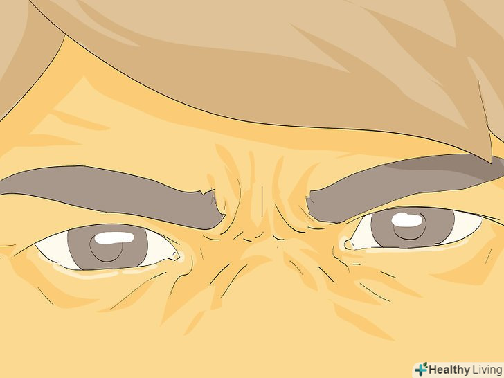 Зробіть на лобі складку.потім, скоротіть м'язи в передній частині чола, щоб зробити на лобі зморшки або підняти брови. У поєднанні з вигнутим вниз ротом, це додасть вашому обличчю трохи глузливий вираз, погляд скоса і вигнуті, сердиті брови. Якщо у вас не виходить це зробити, спробуйте, дивлячись на себе в дзеркало, "вигнути" м'язи між бровами і наскільки це можливо з'єднати їх один з одним.- Це дуже важливо зробити, якщо ви хочете, щоб вираз вашого обличчя відрізнялося від "сумного" похмурого погляду. Без" зморшкуватого " чола, похмурий вигляд може бути не зовсім правильно зрозумілий, але з суворими бровами не зрозуміти ваші емоції буде важко.