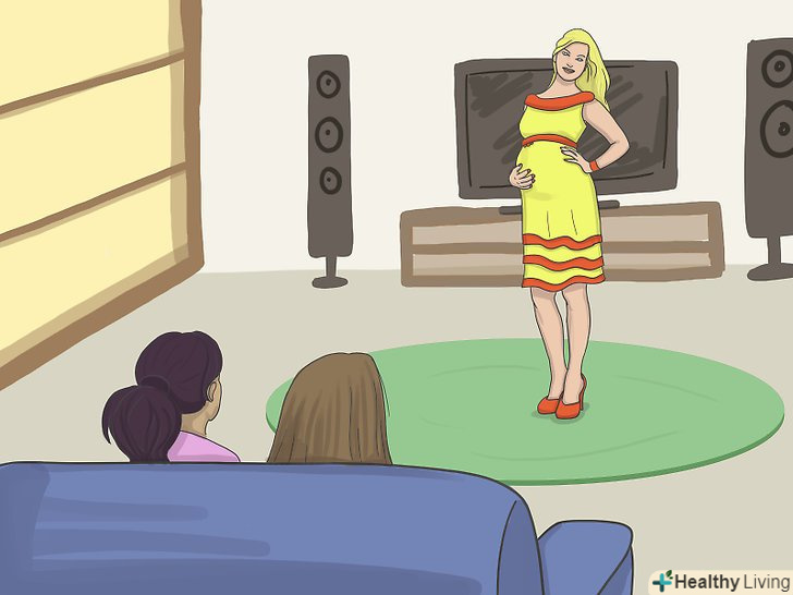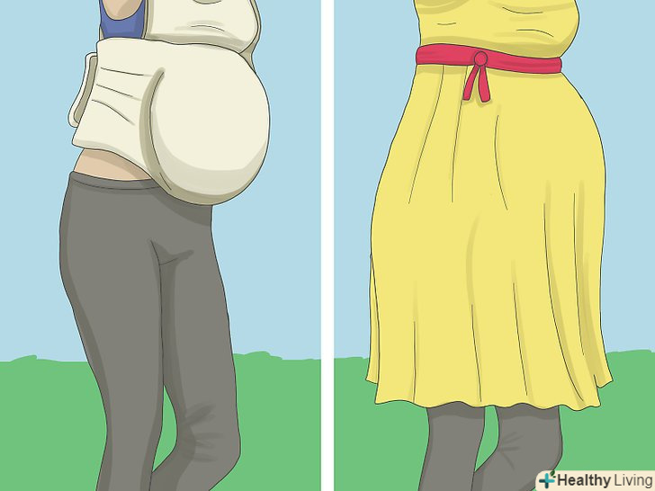 Приміряйте одяг з накладним животом. щоб зрозуміти, як ви будете виглядати в обновках, потрібен накладний живіт. Якщо ви ще не придбали подібну річ, сформуйте його зі свого власного одягу під час примірки. У магазині одягу для вагітних можна навіть для примірки попросити накладної живіт. Пам'ятайте, що речі повинні бути вільними в області живота і грудей.