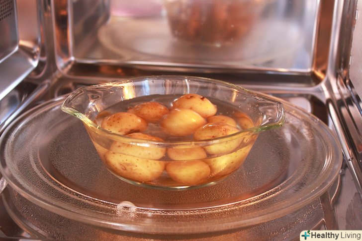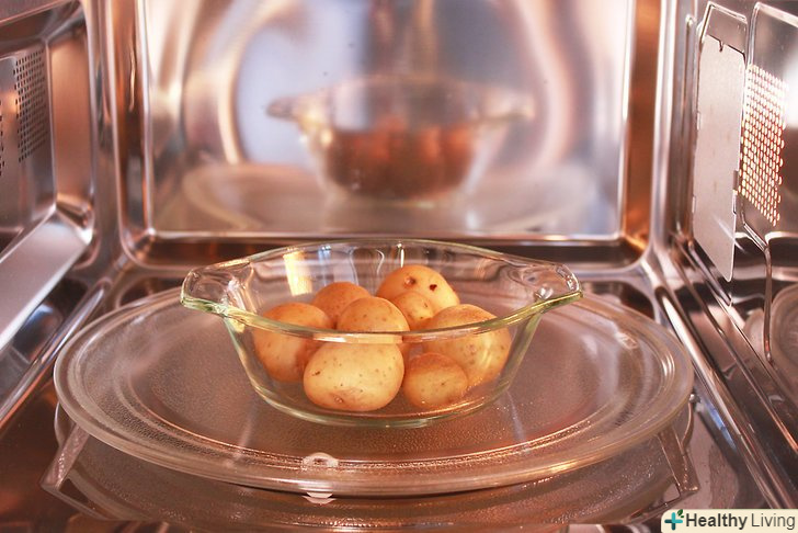 - Приготуйте щось велике (АЛЕ НЕ величезне, залишайте достатньо місця з боків і укладайте інгредієнти вільно, деякі мікрохвильові печі можуть вийти з ладу) НА ПОВНІЙ ПОТУЖНОСТІ. Наприклад, приготуйте на повній потужності кілька кілограм картоплі для пюре, просто накиданого і покритого поліетиленовою плівкою або помитого і складеного в поліетиленовий пакет. (Спробуйте готувати п'ятнадцять хвилин на високій швидкості в розрахунку до 5 кг картоплі.)