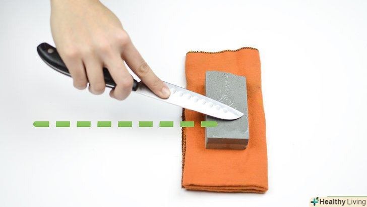 Прикладіть ніж до точильного каменю. однією рукою візьміться за рукоятку ножа і прикладіть його до точильного каменю під кутом в 20 градусів. Ріжучий край леза повинен бути звернений в протилежну від вас сторону. Кінчики пальців другої руки прикладіть до плоскої частини леза поруч з його ріжучим краєм. [7]- Розташовані на лезі кінчики пальців будуть надавати на нього тиск і контролювати положення леза під час заточування.