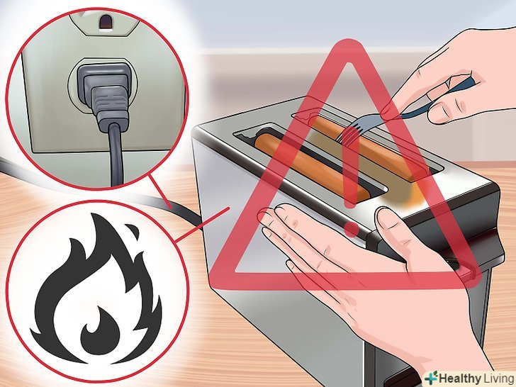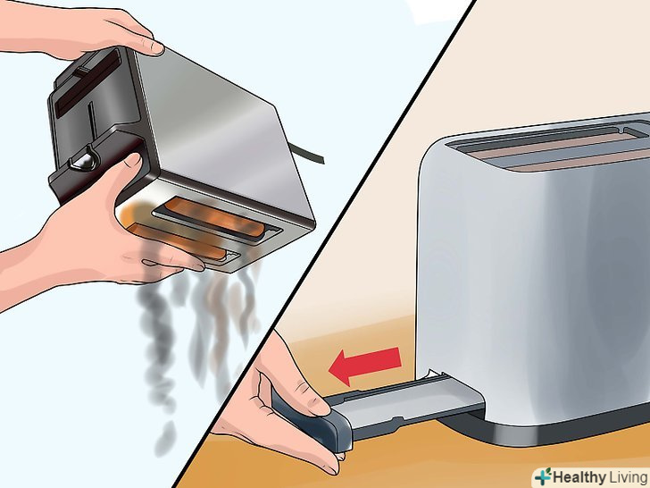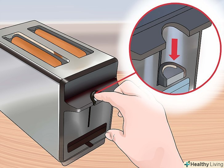 Поводьтеся з тостером обережно.ні за яких обставин не торкайтеся до нього металевими предметами, поки він підключений до мережі. Також не суньте руки в слоти тостера, поки він не охолов. Тостер працює шляхом нагрівання елементів розжарювання до високих температур з використанням при цьому небезпечної електричної напруги. Ви можете отримати опік, якщо доторкнетеся до нього рукою. Якщо в слот потрапить металева вилка, вас може вдарити струмом.[3]- Якщо тост застрягне в слоті, можна спробувати вручну дотиснути важіль, а потім швидко з силою смикнути його вгору, після чого тост вискочить назовні.