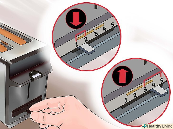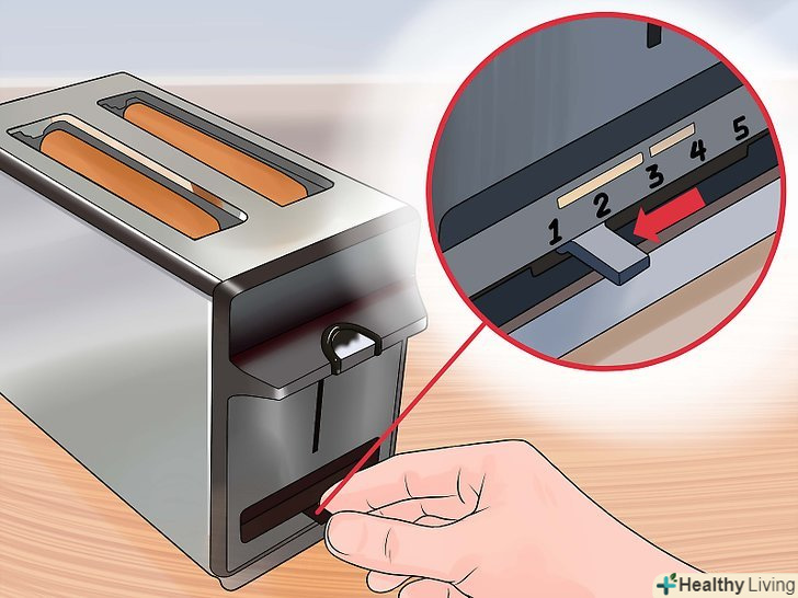Встановіть бажану ступінь обсмажування.за допомогою регулювальної ручки, яка розташована на передній панелі приладу, встановіть бажаний рівень прожарювання. На більшості тостерів ділення шкали вказані в діапазоні від 1 до 5, де 1 – це режим для злегка підсмаженої скоринки, а 5 – для тосту сильної прожарювання. Якщо ви вперше готуєте тости, то ми рекомендуємо вам встановити рівень піджарки на позначку 2 або 3.[2]