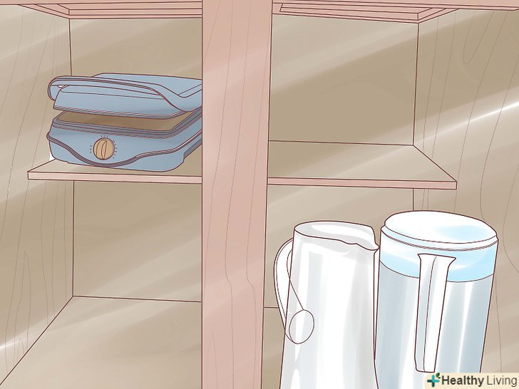Знайдіть місце для електроприладів. ті, якими Ви користуєтеся кожен день, потрібно тримати на стільниці, а ті, якими Ви користуєтеся час від часу, – вафельниця, соковижималка, кухонний комбайн і так далі – потрібно зберігати в шафці. Розставте їх на верхній полиці або нагорі самого шафки. Коли вони вам знадобляться, ви їх легко знімете, а в інший час вони не будуть Вам заважати.