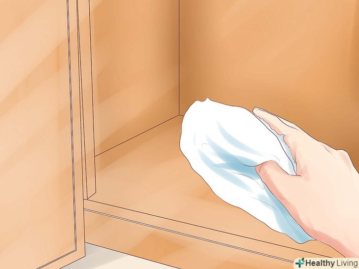 Вимийте шафки від верху до низу. купіть хороші миючі засоби і приготуйтеся ретельно видраить всі кути і закутки, включаючи і дверцята шафок. Вимітіть крихти, відітріть засохлі плями і витріть пил, готуючи шафки для кухонного начиння. Ретельне прибирання запобіжить появі комах і збереже чистоту кухонного начиння.- Якщо ви віддаєте перевагу не користуватися хімічними миючими речовинами, можна зробити спеціальний розчин, розчинивши винний оцет в невеликій кількості води. Таке натуральне засіб для чищення добре впорається з кухонними шафками. А якщо потрібно відтерти щось, з цим допоможе впоратися харчова сода.