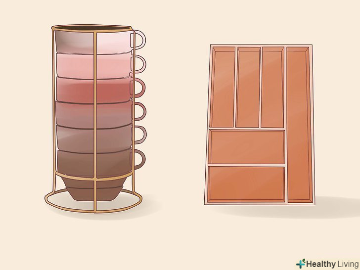 Для більш дрібних кухонних приладдя купіть органайзери. Тепер, коли шухлядки і шафки вичищені і обзавелися підкладками, потрібно впорядкувати в них кухонне начиння. Купувати органайзери зовсім необов'язково, але якщо у вас багато кухонних пристосувань, вони допоможуть уникнути захаращеності і тримати речі на своїх місцях. Подумайте над наступними предметами для шафок:- Органайзер для столових приладів. Деякі кухонні шухлядки продаються з вбудованими органайзерами для столових приладів, але в багатьох такого пристосування немає. Ось якщо у вас його немає, варто витратити кілька доларів на його придбання.