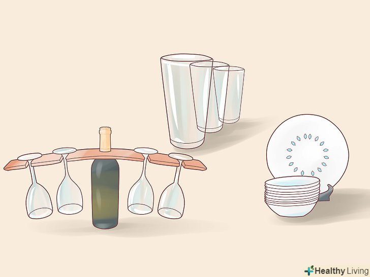 Тонкий фарфор та інші тендітні предмети Зберігайте вище. високо навішені шафки або верхні полиці – відмінне місце для зберігання предметів, які ви боїтеся розбити. Фарфор, келихи на ніжках, тендітні тарілки і страви для запікання і предмети такого роду повинні зберігатися нагорі, щоб дістатися до них було не так легко.
