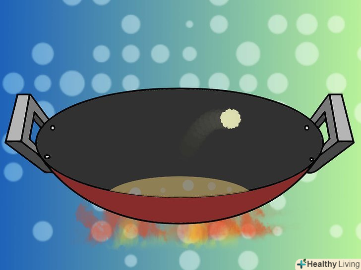 Капніть трохи рослинного масла в сковороду вок і помістіть зернятко попкорну. коли воно вистрілить, зніміть її з вогню і відразу ж протріть всередині і зовні ганчіркою, змоченою в декількох краплях рослинного масла. Залиште її остигати в прохолодній духовці. Після цього, протріть сухою паперовою серветкою і відкладіть в сторону. В принципі, це точно так же, що загартовувати чавунну сковороду.