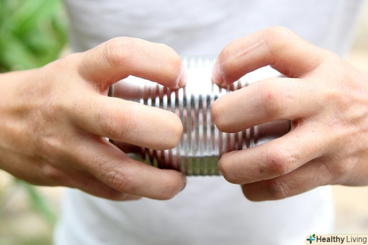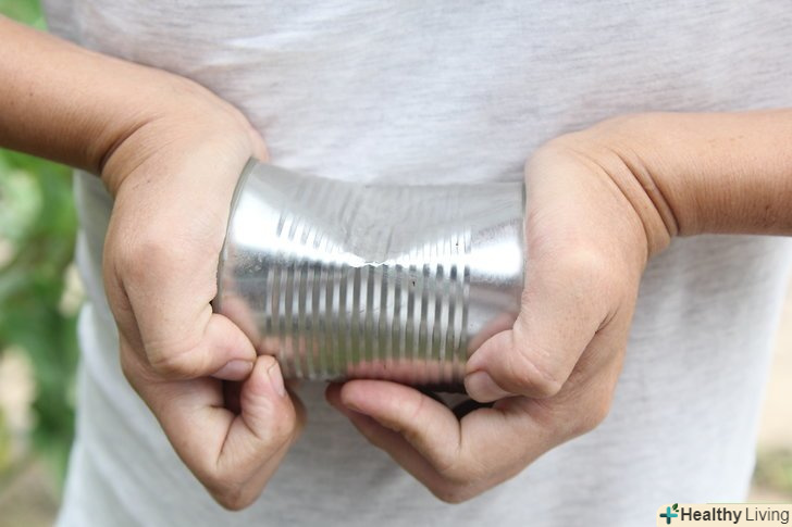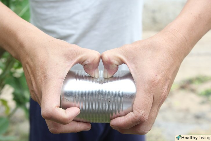 Зробіть вм'ятини ще глибше. Тримайте банку горизонтально, потім упріться зап'ястями в круглі сторони. Розташуйте руки так, щоб вони впиралися в верхні частини плоскої області ближче до краю, а не до центру. Зімкніть пальці разом над вм'ятиною, потім стисніть два кінці разом, підштовхуючи руками. [5] повторіть те ж саме з іншою вм'ятиною.- Якщо це не працює, спробуйте поставити банку на плоску поверхню на землю і натисніть на неї рукою або коліном.