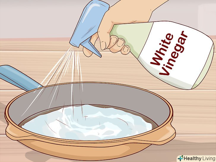 Обробіть ділянку білим оцтом. на наступний день наповніть пульверизатор дистильованим білим оцтом. Це допоможе очистити каструлю або сковороду і зруйнує затверділу пасту з харчової соди.