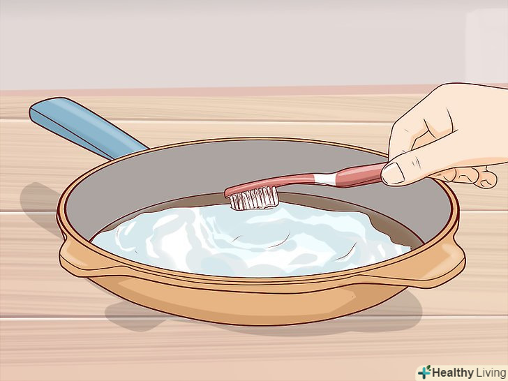 Скребіть і витріть затверділу пасту з харчової соди. візьміть стару зубну щітку і умочіть її в пасту. Протирайте пригорілі Частини посуду круговими рухами, поки паста не зникне. [7]- Не використовуйте абразивні скребки на зразок сталевої мочалки, тому що ними можна подряпати посуд.