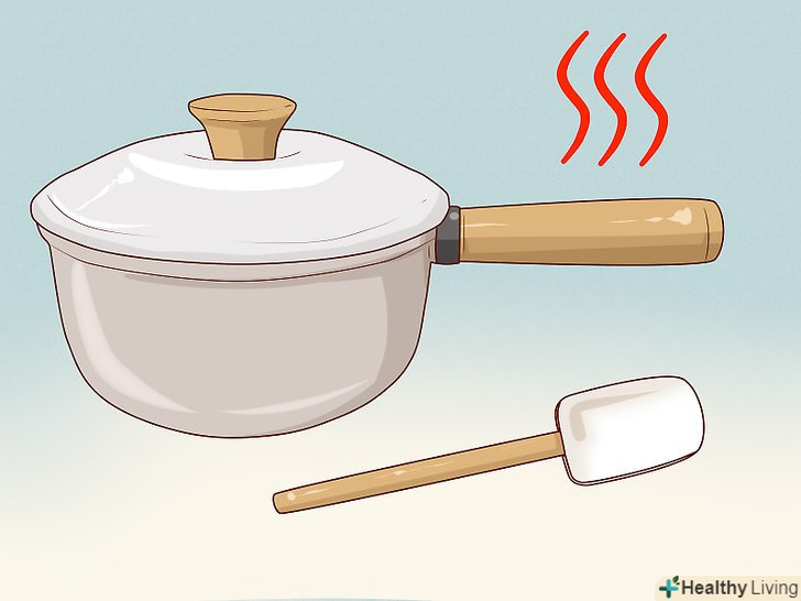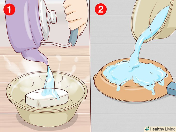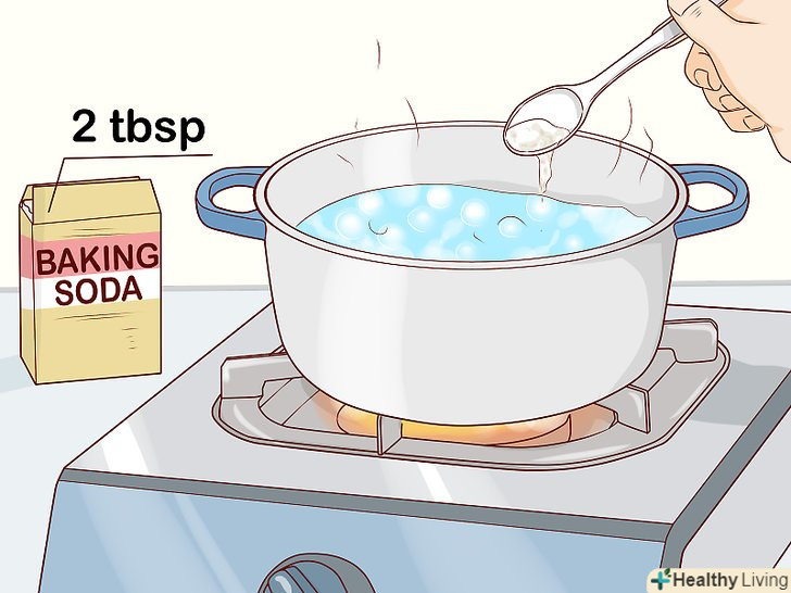 Прокип'ятіть в посуді суміш води з харчовою содою. мірною ложкою відміряйте дві столові ложки (30 г) харчової соди і всипте їх в киплячу воду. Перемішайте соду з водою дерев'яною лопаткою або ложкою. Коли закінчите, вилийте воду з посуду і протріть її ганчіркою. [5]