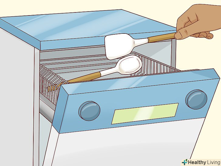 Чистіть силіконові прилади в посудомийній машині. зніміть силіконові частини деяких інструментів з дерев'яних ручок і помийте їх окремо в посудомийній машині. Силікон Le Creuset безпечний для миття в посудомийній машині і не повинен деформуватися або розплавитися. Ретельно висушіть силіконові прилади, перш ніж знову закріпити їх на дерев'яних частинах. [11]