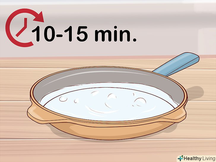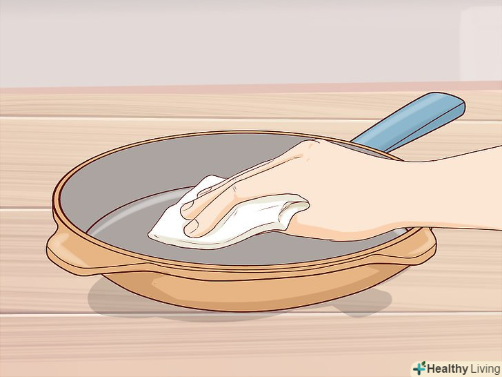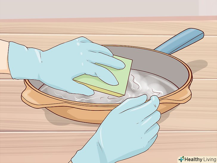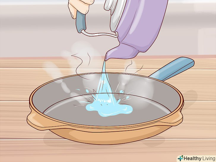Сполосніть сковороду гарячою водою. промийте посуд під гарячою водою, щоб змити з неї всю піну і залишки миючого засобу. [4]