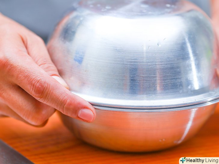 Знайдіть дві миски. їх верхні частини повинні щільно прилягати один до одного. Вибирайте одну миску трохи більше іншої або одного розміру з широким обідком. Легкі металеві миски вельми міцні, і їх легко струшувати, проте можна використовувати ємності і з інших матеріалів. Головка буде розпадатися на зубчики сама по собі під час тряски. [1]- Можна використовувати чашки, банки, легкі каструлі, шейкери або будь-які інші міцні контейнери, які легко утримувати в руках і легко мити після цього.