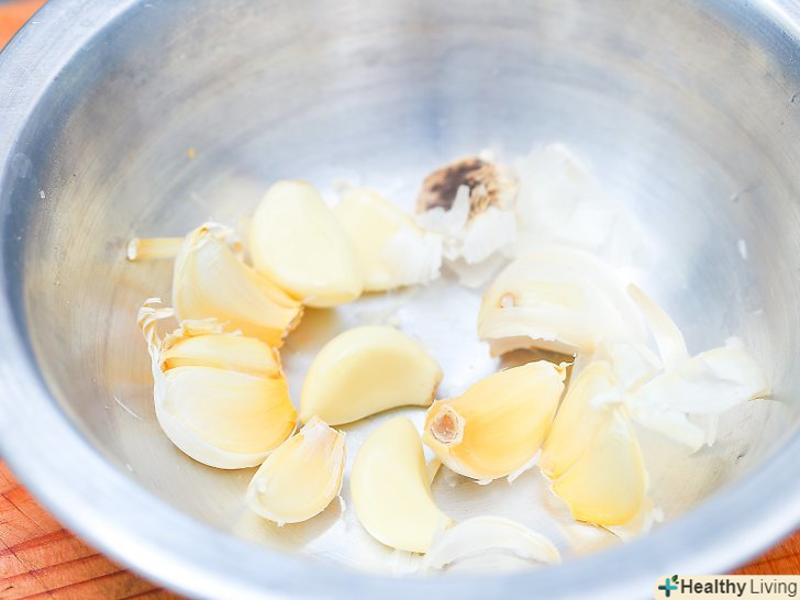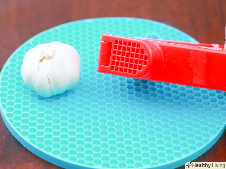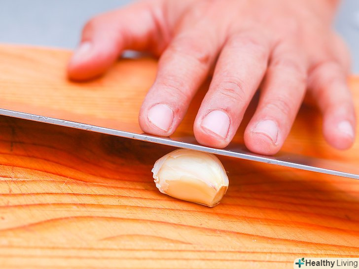 Роздушіть кожен окремий зубчик ножем. розділіть головку часнику на окремі зубчики або відріжте один зубчик за допомогою ножа. Розташуйте плоске широке лезо ножа поверх зубчика часнику. Натисніть долонею на лезо. Зубчик буде злегка розчавлений, і шкурка легко відокремиться від нього. [4] Тепер ви можете пропустити часник через часничницю до утворення пасти.- Якщо у вас немає широкого ножа, натисніть на зубчик часнику твердою частиною долоні. [5]