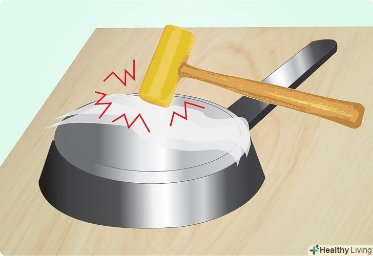 В цей час знайдіть стійкий до подряпин шматочок дерева, пластиковий молоток або щось подібне.можна використовувати будь-який важкий предмет, головне, щоб він був м'якше металу, з якого зроблена сковорода.
