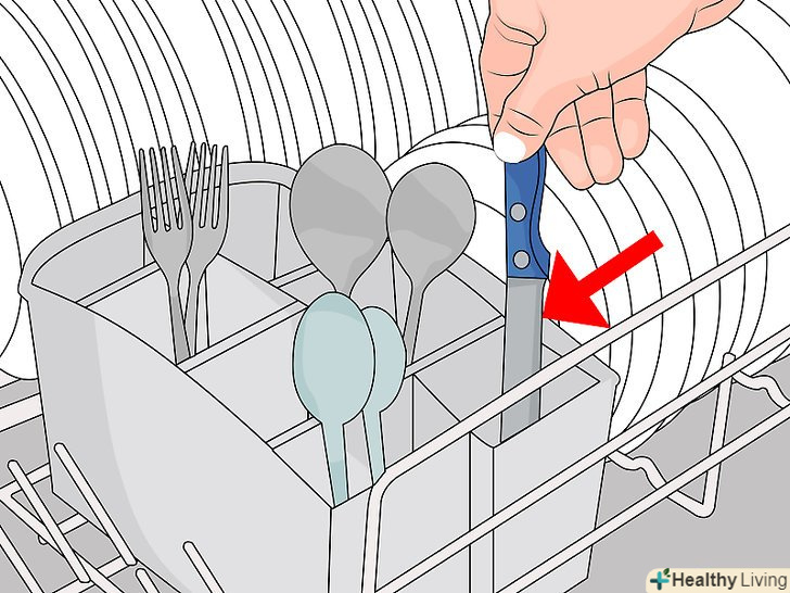 Завантажте кошик для столових приладів, по можливості розділяючи їх один від одного.помістіть ножі, виделки і ложки в спеціальний кошик ручкою вниз. Як правило, небезпечні або гострі ножі краще вимити вручну, так як посудомийка може їх затупити. Не ставте в посудомийну машину столові прилади з дерев'яними ручками або дерев'яний посуд.- Розставте столові прилади окремо один від одного, але так, щоб вода легко змогла дістатися до їх брудних поверхонь. Правильна сортування-це ключ до якісної мийці.