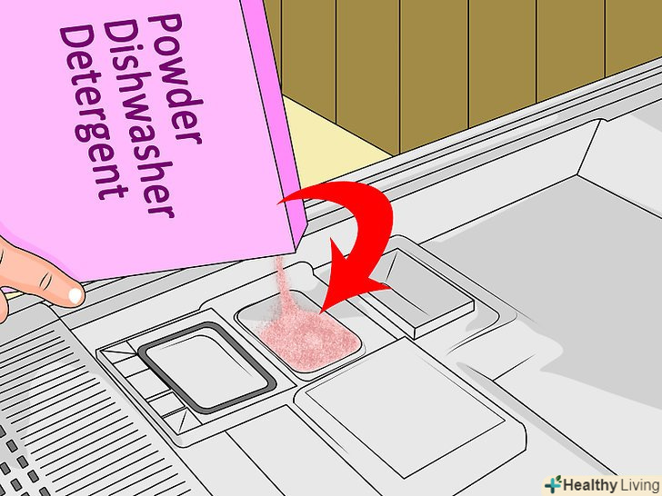 Заповніть порошковим миючим засобом спеціальний контейнер, розташований в нижній частині посудомийної машини або на двері.заповніть його до необхідного рівня. Якщо ви використовуєте таблетований миючий засіб, покладіть одну таблетку на дно дверцят посудомийної машини. Залежно від температури води і тривалості циклу мийки, частина покриття таблеток може розчинитися в повному обсязі, що в підсумку призведе до закупорки труб. Через це деякі виробники посудомийних машин не рекомендують використовувати таблетований миючий засіб.- Якщо у вашій посудомийній машині є два контейнери для миючого засобу, спершу заповніть той, що розташований на двері. Він повинен відкритися після того, як посудомийна машина закінчить Попереднє ополіскування для пом'якшення бруду.
