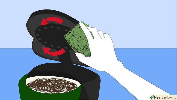 - Спустошіть і почистіть фільтр. відкрийте кришку вгорі кавомашини. Дістаньте фільтр і викиньте його вміст. Сполосніть фільтр за допомогою розпилювальної насадки або крана в раковині на кухні. Плями в фільтрі можна прибрати м'яким засобом для миття посуду і теплою водою. Сполосніть фільтр, після чого знову вставте його в кавоварку. [3]