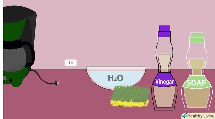 Вимкніть кавоварку від електромережі. зачекайте кілька хвилин, щоб кавоварка охолола. Потім візьміть все необхідне для чищення-губку, оцет і рідина для миття посуду. [9]- Спустошіть глечик і фільтр. вилийте залишився кави з глечика. Потім викиньте вміст фільтра. За допомогою чистої губки, гарячої води і м'якого засобу для миття посуду вимийте глечик і фільтр. Поверніть фільтр на місце. [10]