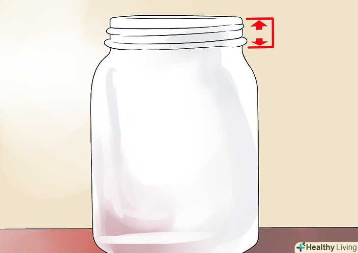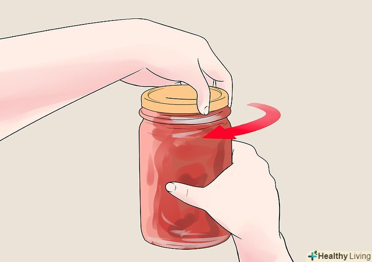 Залиште 0.6 см вільного місця зверху джему або 1.3 см для цілих фруктів. Нахиліть одну сторону банки, щоб видалити бульбашки. Накрийте кришкою банку і закрутіть на неї кільце.- Трохи вільного місця важливо, це допомагає банку зберегти додатковий кисень і дихати, коли ви закрутили банку.