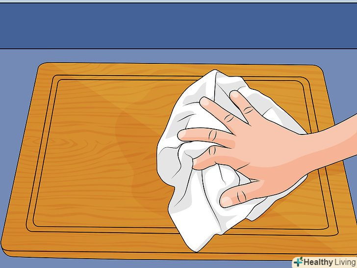 Очищайте обробну дошку після кожного використання.дерев'яні Обробні дошки ніколи не можна відкладати в сторону, щоб очистити трохи пізніше. За цей час залишки їжі і патогенні організми можуть проникнути в саму деревину. Обов'язково очищайте дерев'яну дошку відразу після використання. Завжди мийте дошку тільки вручну. Дерев'яні Обробні дошки не можна мити в посудомийній машині.[6]- Для протирання обробної дошки використовуйте рідкий миючий засіб для посуду і вологу ганчірочку. Закінчивши роботу, зітріть з дошки залишки миючого засобу інший вологою ганчіркою.