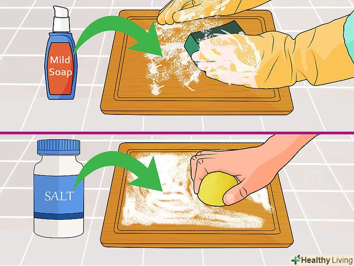 - Деякі засоби для миття посуду не кращим чином впливають на деревину. Якщо ви не хочете обробляти обробну дошку хімічними миючими засобами, спробуйте для очищення посипати її сіллю. Після чого зітріть сіль лимоном. Коли закінчите роботу, просто сполосніть і витріть дошку.[7]