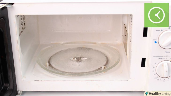 - Увімкніть її на 5 хвилин.якщо у вас потужна мікрохвильовка, вам може знадобитися менше часу. Обов'язково спостерігайте за процесом в перший раз, коли будете застосовувати цей спосіб. Вода з оцтом обдасть парою стінки печі і допоможе розм'якшити засохлу їжу.