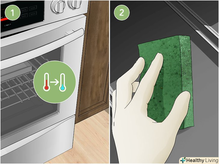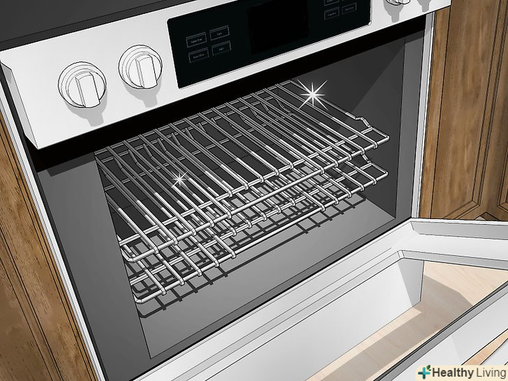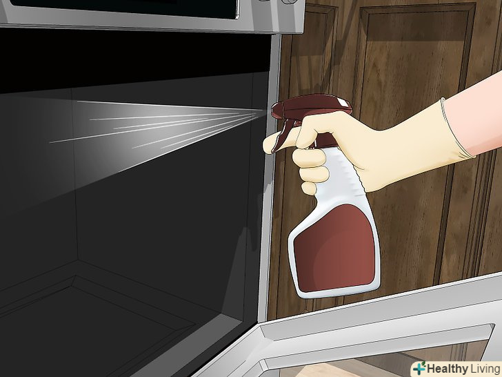 Обприскати внутрішню поверхню духовки покупним миючим засобом.перш ніж використовувати миючий засіб, надіньте гумові рукавички і захисні окуляри. Можна також відкрити вікна на кухні. Обов'язково вивчіть наведені на упаковці вказівки щодо застосування. Як слід обприскати внутрішню поверхню духовки миючим засобом і приділіть особливу увагу брудним місцям.- Покупні чистячі засоби дуже ефективні і швидко діють, проте вони часто містять агресивні хімічні речовини, тому необхідно використовувати гумові рукавички і захисні окуляри.