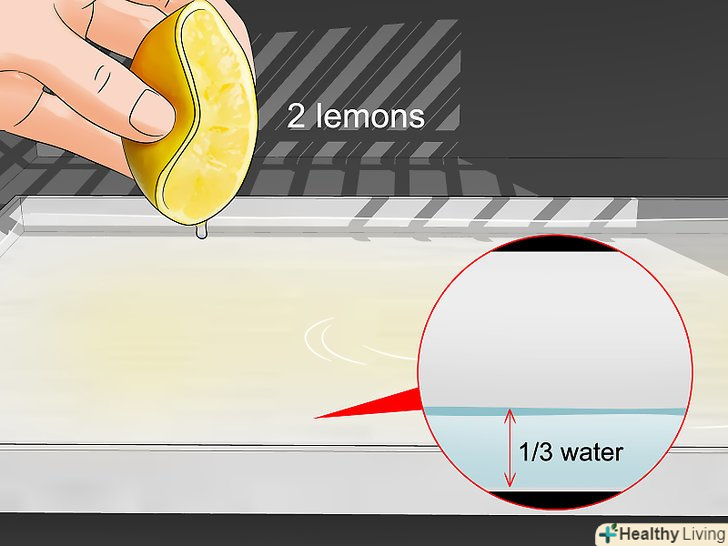 Вичавіть в деко два лимона і заповніть його на 1/3 водою.розріжте кожен лимон навпіл і видавіть сік в деко. Якщо сік погано видавлюється, можна використовувати прес для цитрусових. Потім заповніть деко водою на 1/3. Покладіть в деко шкірку лимонів після того, як ви видавите з них сік.[8]- Даний метод зручний тим, що не потрібно виймати з духовки решітки. Лимонний сік і вода розм'якшать пристала до грат бруд, і ви зможете очистити їх разом з внутрішньою поверхнею духовки.