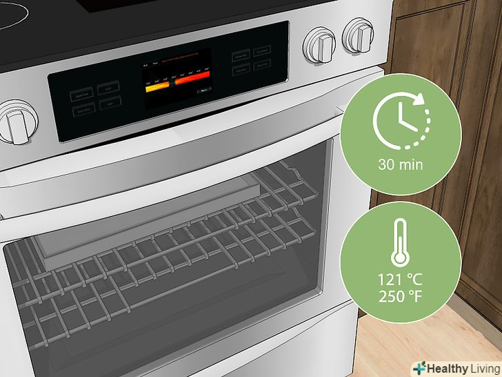 Розігрівайте деко з водою і лимонним соком 30 хвилин при температурі 120 °C. попередньо розігрійте духовку. Коли в ній встановиться потрібна температура, поставте деко на одну з решіток і встановіть таймер на 30 хвилин.- При цьому в духовці може виділятися пар, що цілком нормально. Просто увімкніть вентиляцію і при необхідності відкрийте вікно.