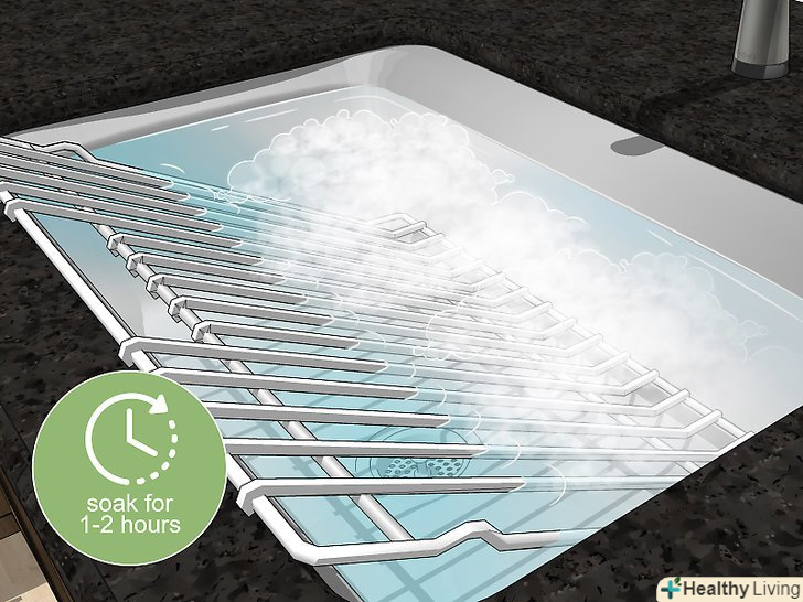 Поки паста з соди робить свою справу, почистіть решітки.покладіть їх у раковину, якщо вони поміщаються туди. Якщо раковина занадто мала, чистіть решітки у ванні. Просто наповніть раковину або ванну теплою водою і додайте приблизно 1/4 склянки (60 мілілітрів) засобу для миття посуду, поки напускаєте воду. Залиште решітки у воді на 1-2 години, потім обполосніть їх і протріть губкою або мочалкою для посуду.[4]- Якщо деко також забруднився, саме час дістати і як слід почистити його. Поступите з листом так само, як з гратами, і витріть його внутрішню поверхню вологою ганчіркою для посуду. Якщо деко дуже брудний, почистіть його пастою з харчової соди.