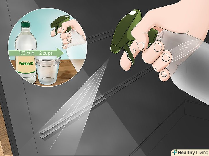 Обприскати внутрішню поверхню духовки сумішшюБілого оцту і води.розведіть 1/2 склянки (120 мілілітрів) білого оцту 2 склянками (480 мілілітрів) води. Залийте розчин в чисту пляшку з розпилювачем і обприскати всю внутрішню поверхню духовки. Залишки харчової соди вступлять в реакцію з оцтом і почнуть пінитися.[5]- Даний крок дозволить краще очистити духовку і видалити всі залишки харчової соди.
